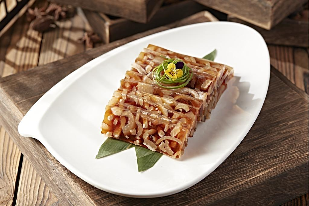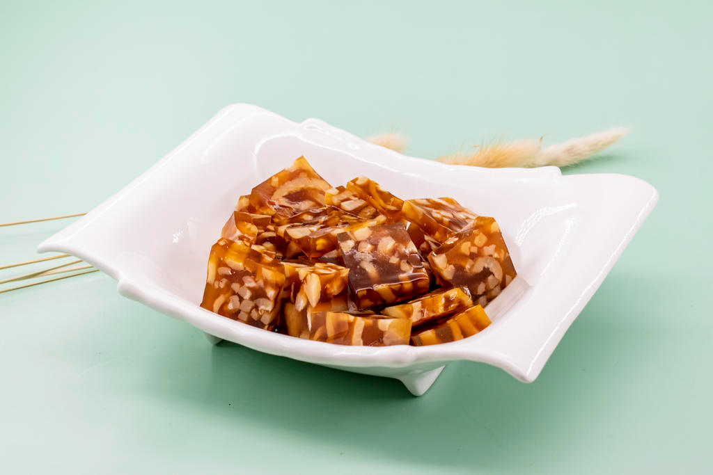 在烟台的年夜饭凉菜清单里,猪皮冻绝对拥有姓名,爽滑弹牙、鲜美不腻,晶莹剔透的模样自带“财源滚滚”的好寓意。传统做法讲究“慢工出细活”,猪皮反复刮净油脂,加葱姜八角慢熬两三个小时,撇去浮油后冷藏定型,切小块蘸上蒜泥、米醋、香油,Q弹爽口,鲜而不腻。